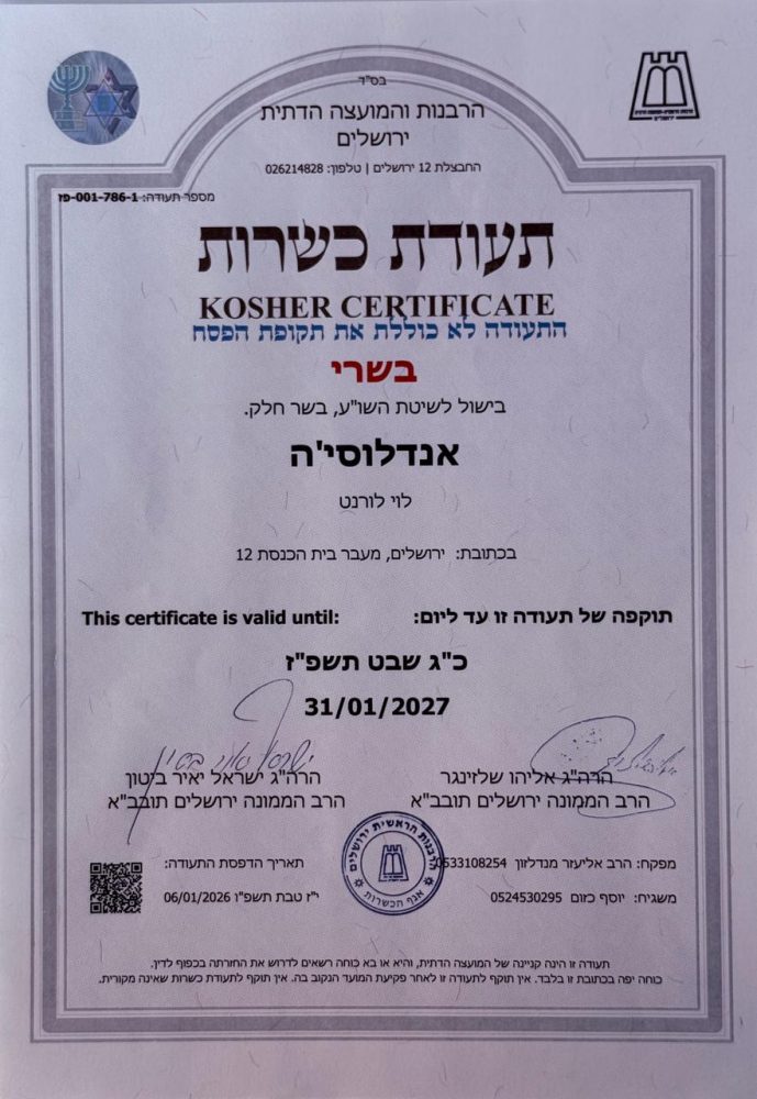 Andalucia היא בר ומסעדת טאפאס כשר המשלב מנות שף טעימות, קוקטיילים נפלאים ועיצוב פנים יפהפה בכיכר המוזיקה. אנדלוסיה מציעה מטבח ספרדי מסורתי המותאם לחיך הישראלי. מנות טאפאס מיוחדות על בסיס דגים טריים ובשר עסיסי, לצד מנות לטבעונים/צמחונים שביניכם. בבר שלנו תמצאו מיקסולוגים מקצועיים שיכינו עבורכם מבחר רחב של קוקטיילים קלאסיים ומיוחדים. אנדלוסיה ממוקמת בתוך בניין מוקף אבן ירושלמית אותנטית. מצד אחד עיצבנו את החלק החיצוני של הבר בסגנון עתיק, כדי להתאים אותו לסגנון האדריכלי של סביבתו הירושלמית, ומצד שני יצרנו פנים ססגוני ומודרני, המעניק למקום את הסגנון המיוחד שלו, מזכיר מקומות מפורסמים ברחבי העולם. למסעדה יש מספר אזורים פרטיים לאירועים, מרתף יינות וקומה פרטית לאירועים עם טרקלין יוקרתי ומרפסת המשקיפה על כיכר המוזיקה.
